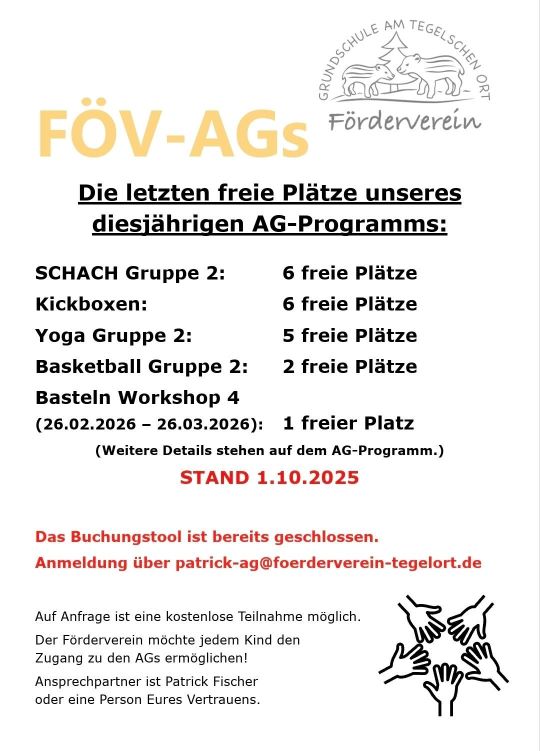 - Mitte Februar trifft sich das AG-Team um in die Planung des AG-Programms für das Schuljahr 2020/2021 zu beginnen. Wer sich hier einbringen mag, bitte melden. Viele Hände, schnelles Ende.
